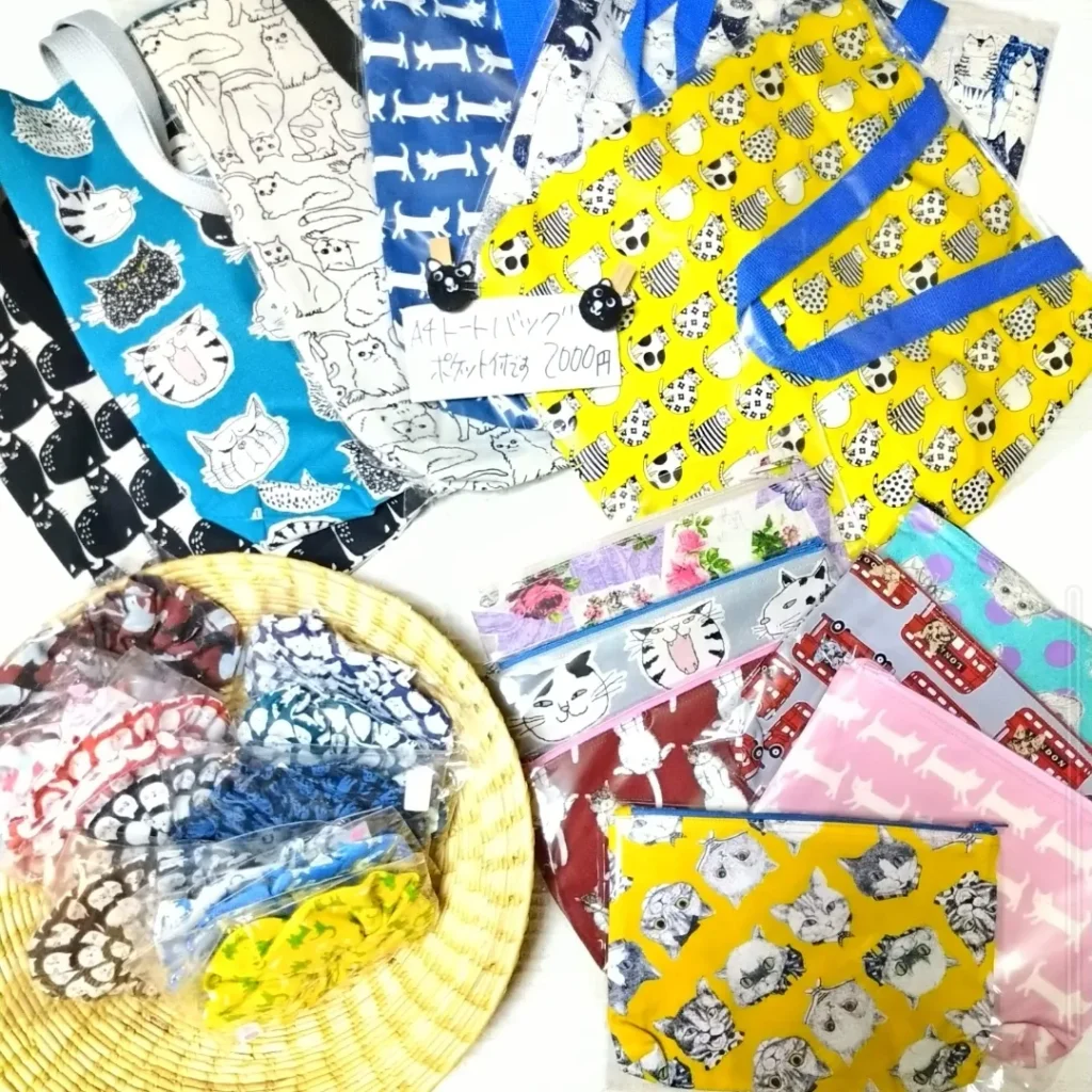 ハンドメイドのバッグや、ポーチ、シュシュ、生花、猫柄鉢などが並びます!