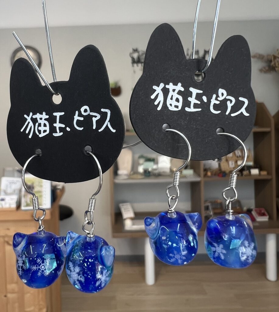 ガラス工芸品で作った猫のアクセサリーや、猫柄の布小物などをお持ちいただけます!