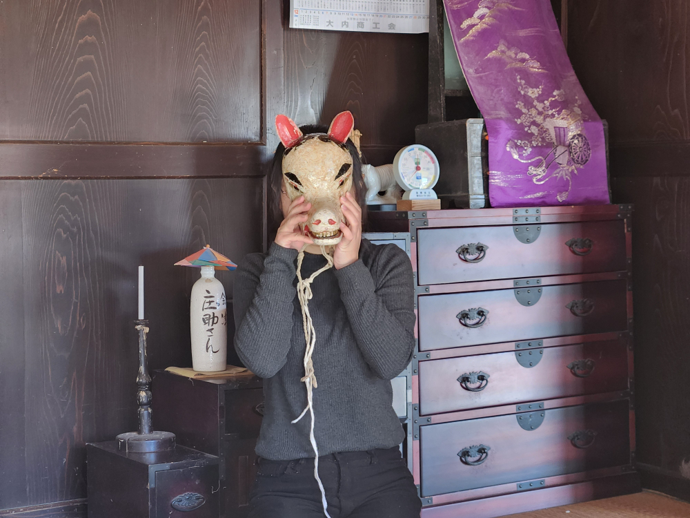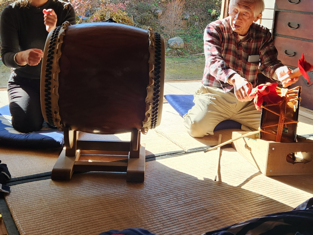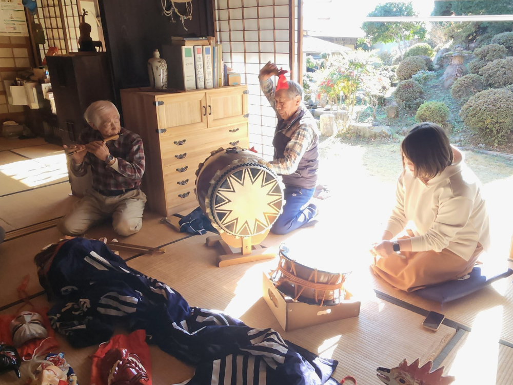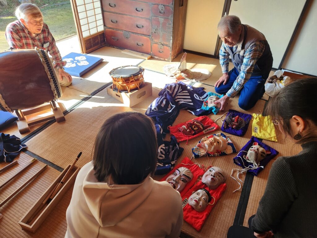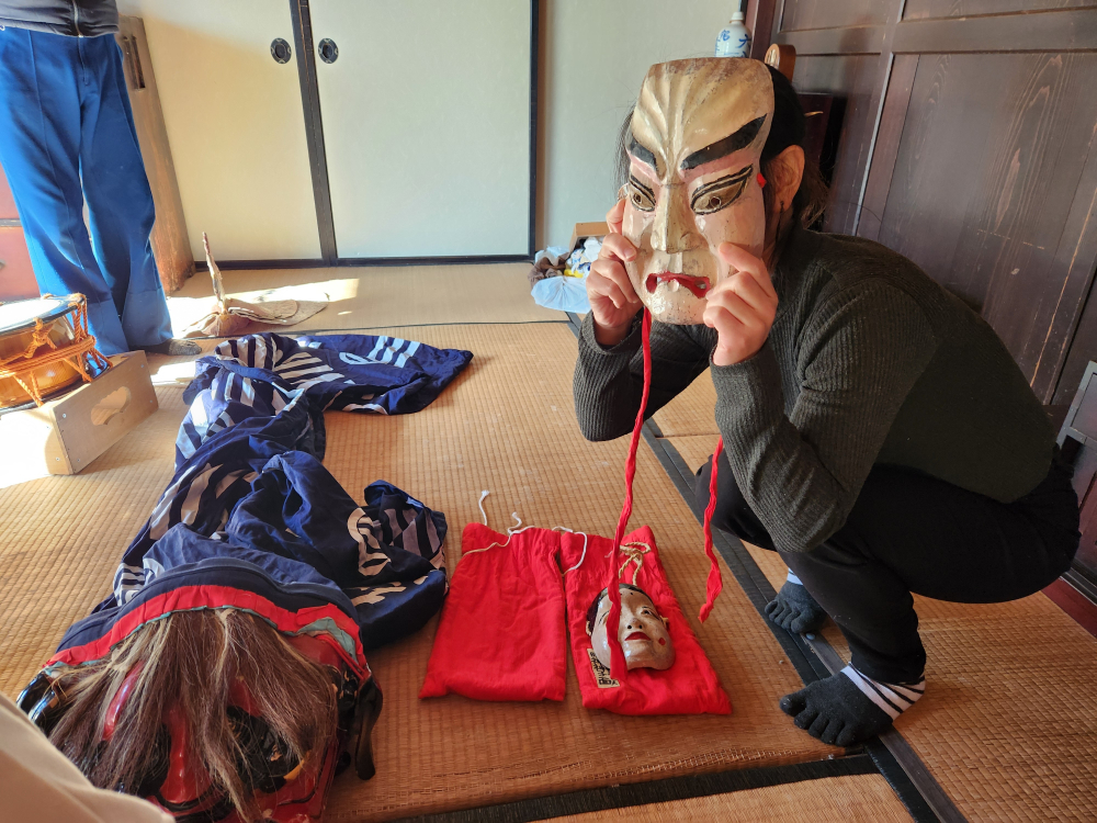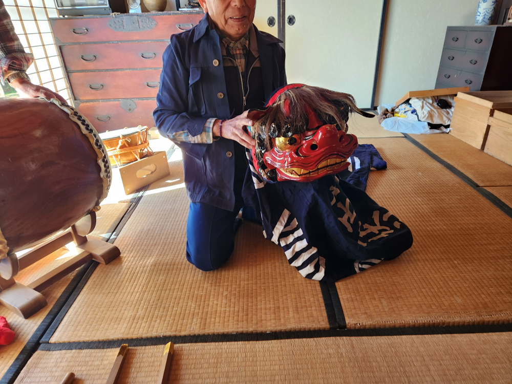実際に使っている獅子頭や御面、囃子道具に触れる体験!