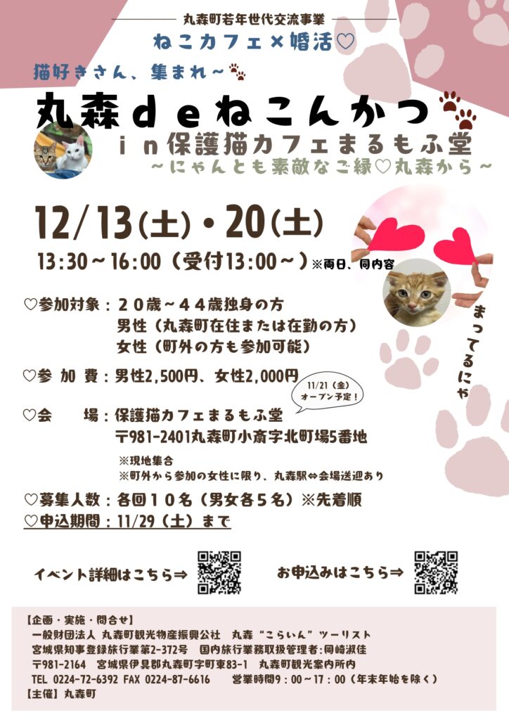 場 所/保護猫カフェまるもふ堂(丸森町小斎字北町場5番地) ※11/21(金)オープン予定 ※現地集合・解散 希望者は丸森駅からの送迎あり(女性のみ)