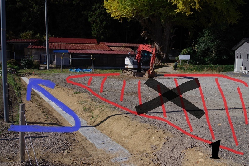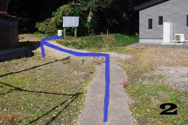 大イチョウ前の駐車場の角から歩いて行けますが、写真の赤線の範囲は個人さまの敷地になります。