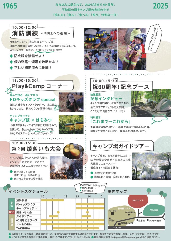 | 詳細 | 10:00-12:00 消防訓練(スタンプラリー形式!) 10:00-15:30 祝60周年!記念ブース キャンプ場ガイドツアー 第2回焼きいも大会 13:00-15:30 Play&Campコーナー ・FDキッズクラブ special ・キャンプキッチン ほか |