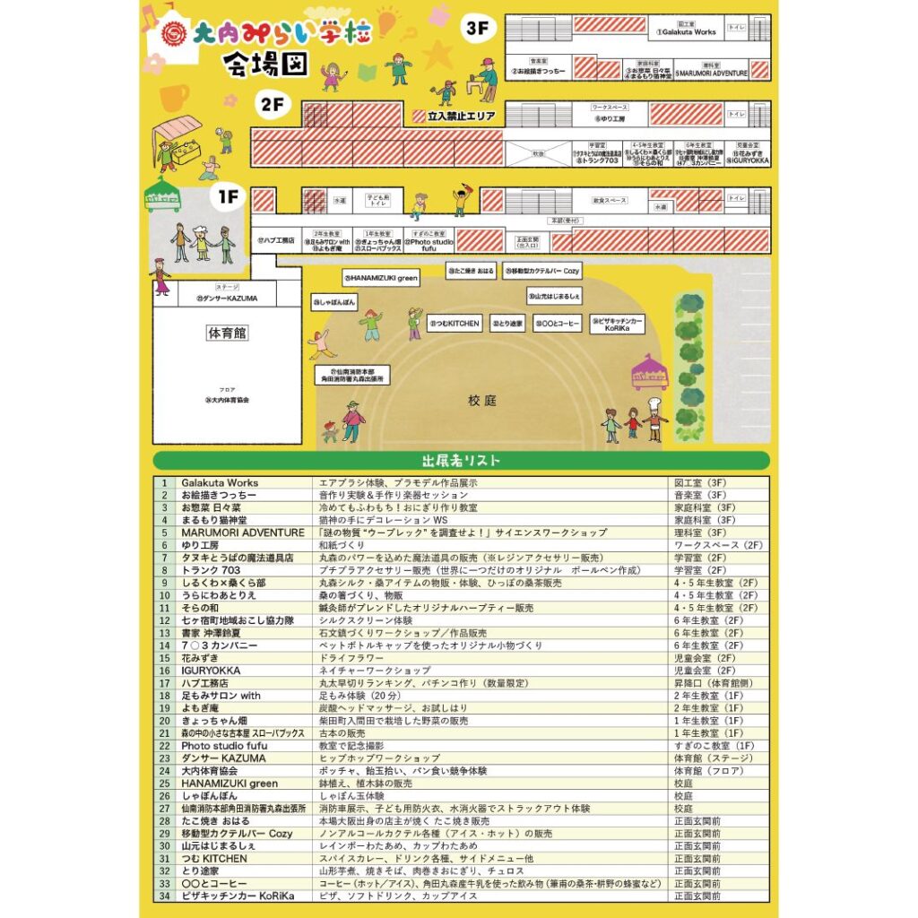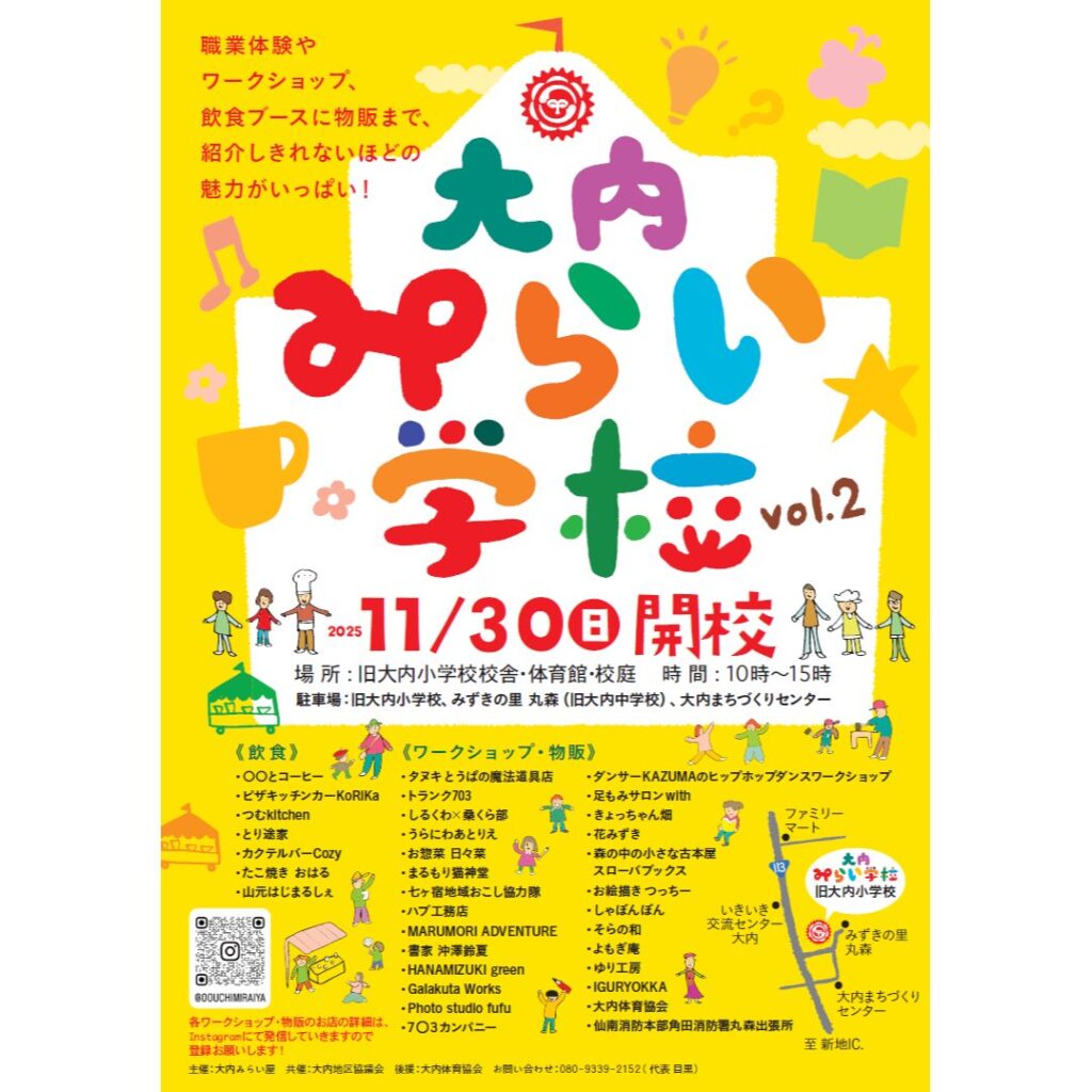 | 詳細 | 日 時:2025年11月30日(日) 10:00~15:00 場 所:旧大内小学校校舎・体育館・校庭 (宮城県伊具郡丸森町大内字横手18番地) 駐車場:旧大内小学校、みずきの里丸森(旧大内中学校) 大内まちづくりセンター 内 容:職業体験やワークショップ、飲食ブースに物販まで、 紹介しきれないほどのお店が集まります。 校舎、体育館、校庭をすべて使います!! 懐かしのあの教室、特別教室でのワークショップなどなど 一日あっても足りない体験が出来ます!! 昼 食:給食の時間として12時~13時はワークショップがお休みになります。 みんなで飲食ブースから給食を買ってお話をしながら休みましょう♪ 入場料:無料 ※ワークショップは別途参加費がかかります。 詳細は公式HPをご確認ください。 https://www.facebook.com/ouchi.miraiya |