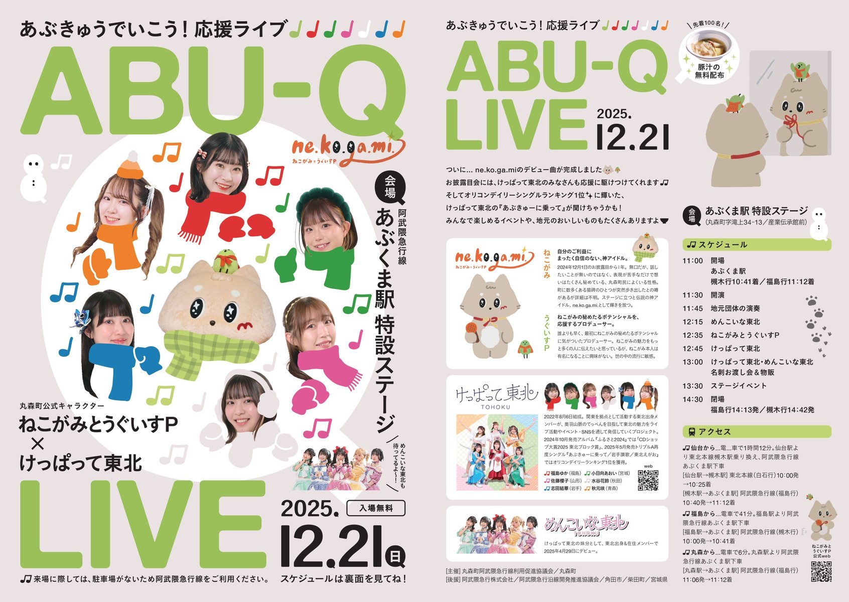| 詳細 | =詳細内容= 日時:2025年12月21日(日) 11:00~14:30 場所:あぶくま駅 特設ステージ 問合:丸森町阿武隈急行線利用促進協議会 (丸森町企画財政課内)TEL:0224-72-3024 入場無料 ※会場には駐車場がありません。 阿武隈急行をご利用ください。 =当日の出店内容=: ①(一財)丸森町観光物産振興公社(町の特産品、お酒など) ②Big moon(焼き鳥、フライドポテトなど) ③kopan(肉まん、ラーメンなど) ④MARUMORI CAFE所属・地域おこし協力隊・河野さん(猫神の手) ⑤蔵王酒造(日本酒) ⑥阿武隈急行㈱(阿武隈急行グッズ販売) ※「ねこがみとうぐいすP」ブースもあり! |